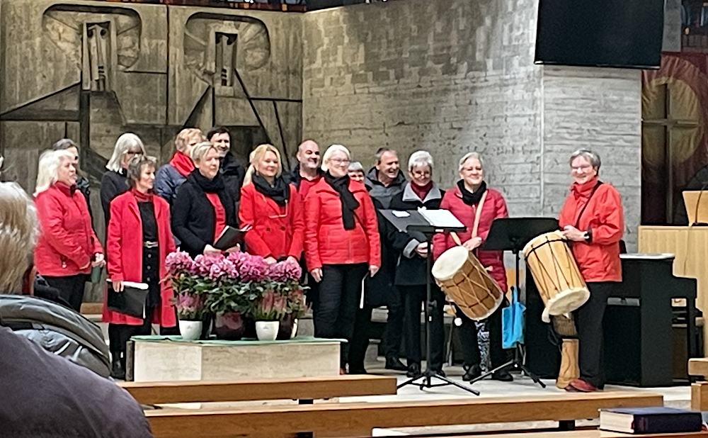 • ein gemischter Chor, der zumeist a cappella oder mit Trommel-/Gitarrenbegleitung singt,